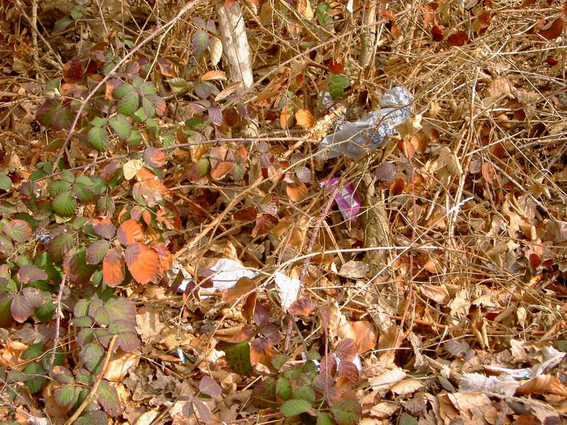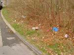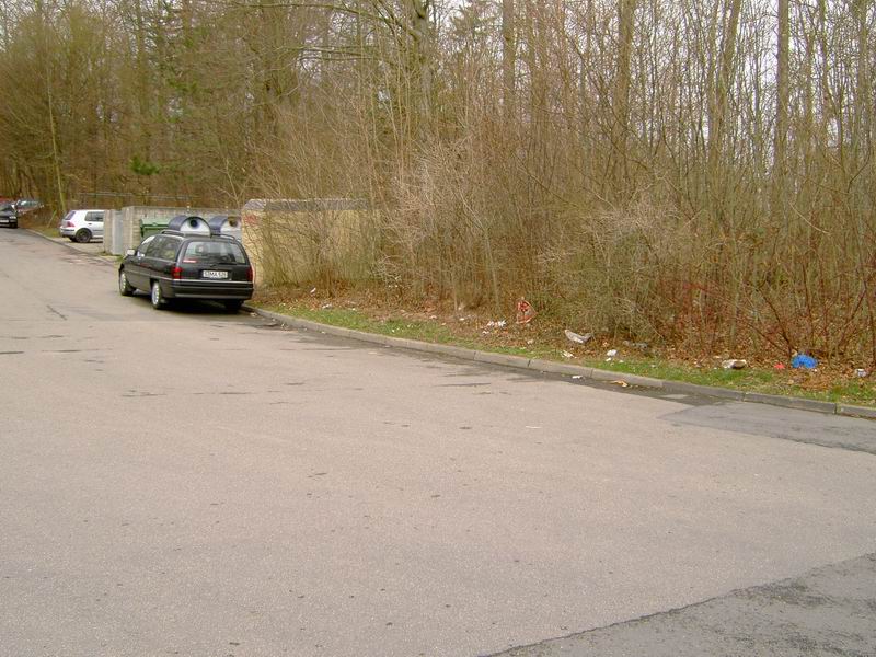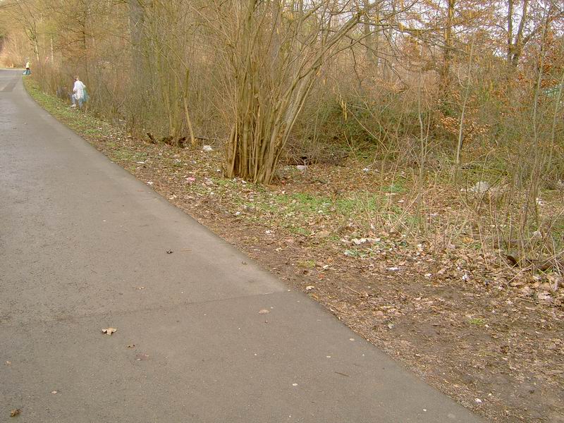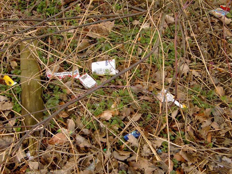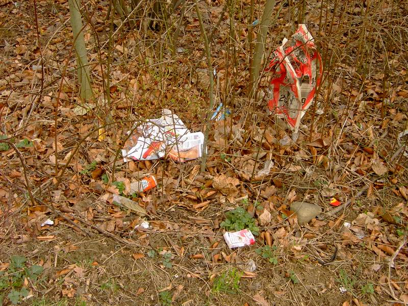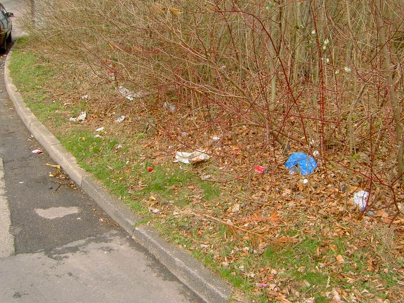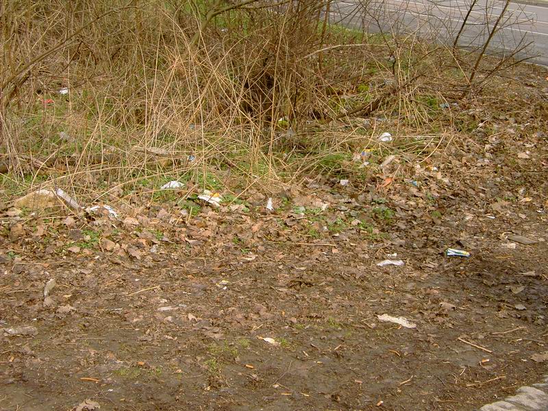 So sah es noch am Morgen des 20. März 2004 direkt neben der Baushaltestelle aus.  Der nächste Mülleimer ist nur wenige Meter entfernt. Trotzdem lagen viele kleine und mittlere Verpackungen in den Büschen herum.