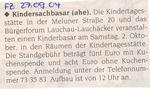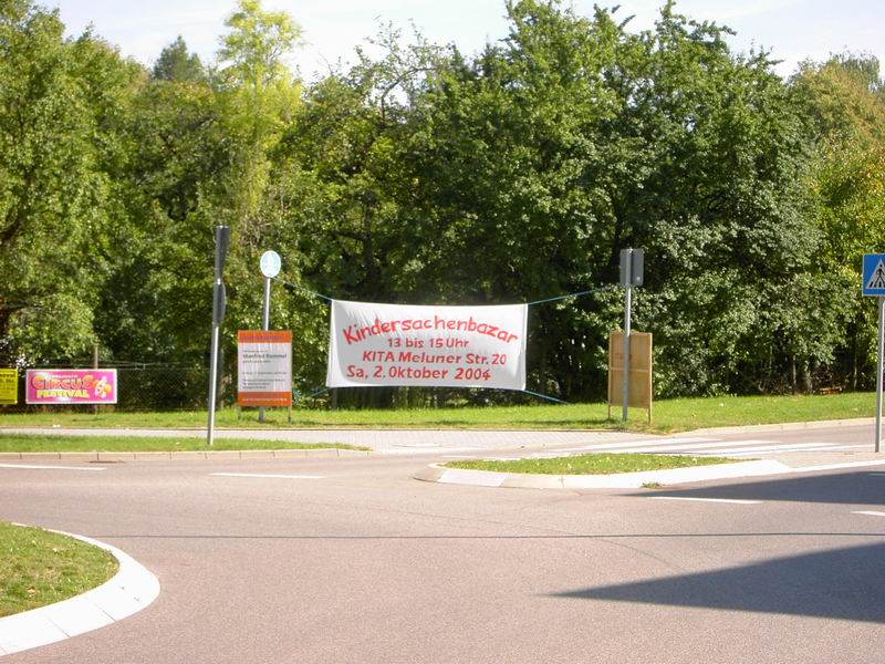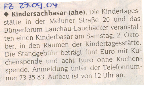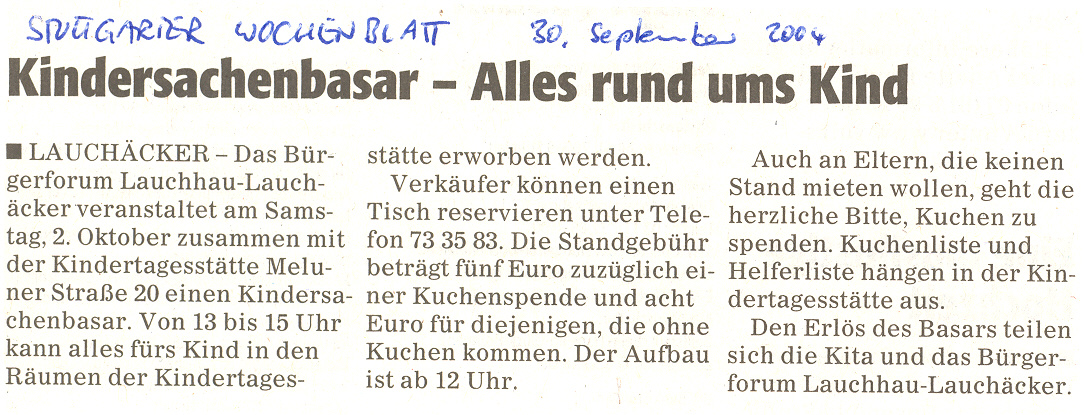 Am 2. Oktober 2004 veranstaltete das Bürgerforum Lauchhau-Lauchäcker e.V. mit der KITA in der Meluner Straße 20 den dritten KINDERSACHENBAZAR in den Lauchäckern. 20 Tische konnten vermietet werden. Der Besuch und der Verkauf waren auch diesmal sehr rege. Die Presse hatte unsere Anzeigen gut plaziert. In den Wochen vor dem Bazar hatten wir überall in Vaihingen und in den KITAs DIN-A6-Flyer verteilt und Aushänge aufgehängt. Außerdem hatten wir noch einen großen Banner gemalt und am Kreisverkehr aufgehängt.