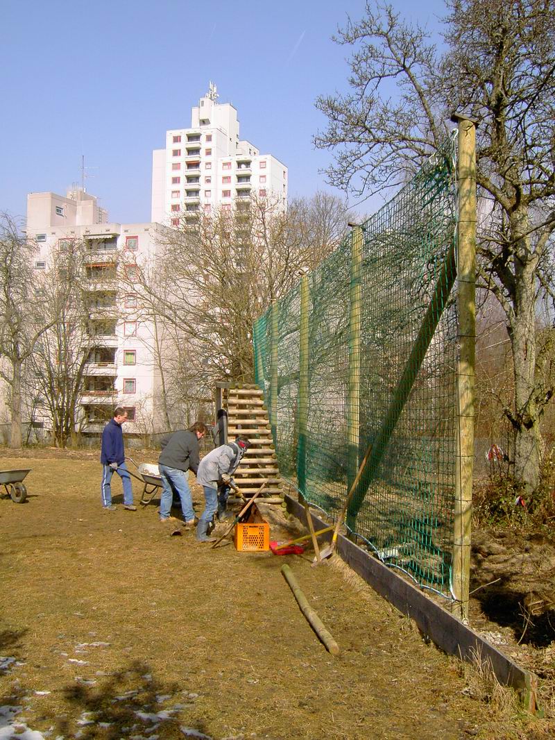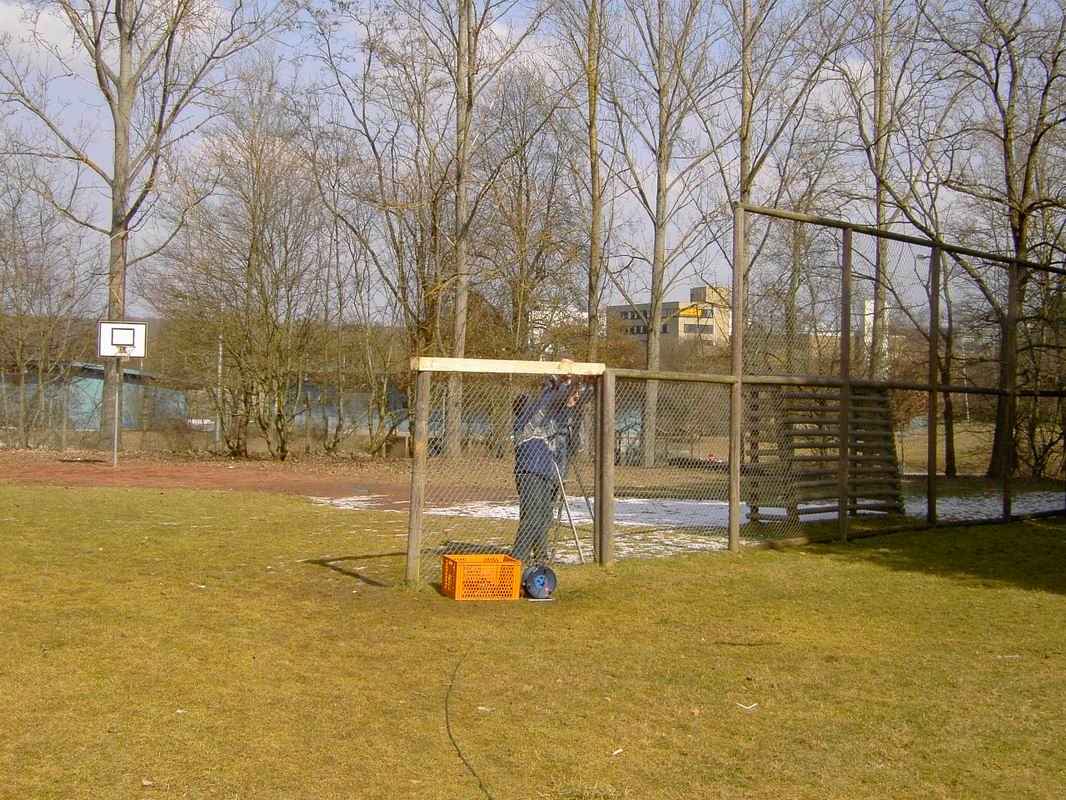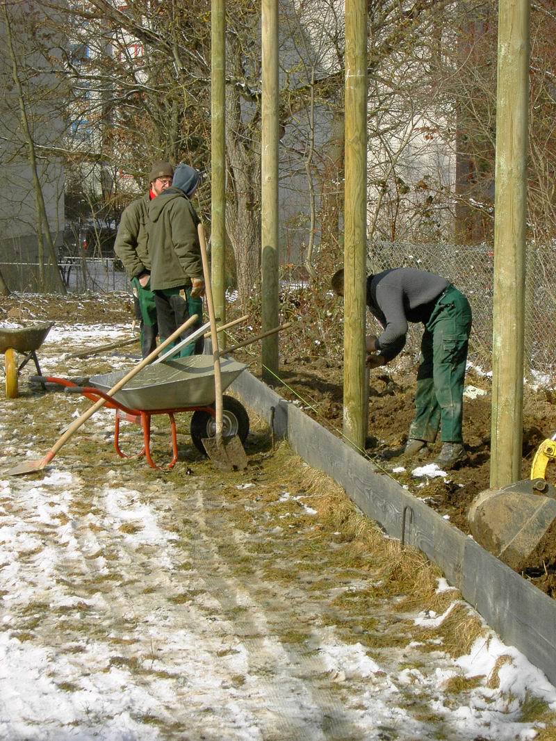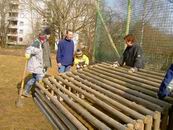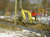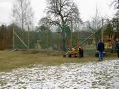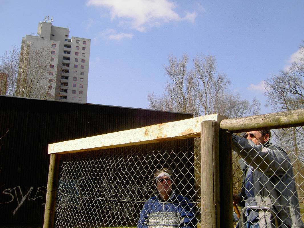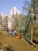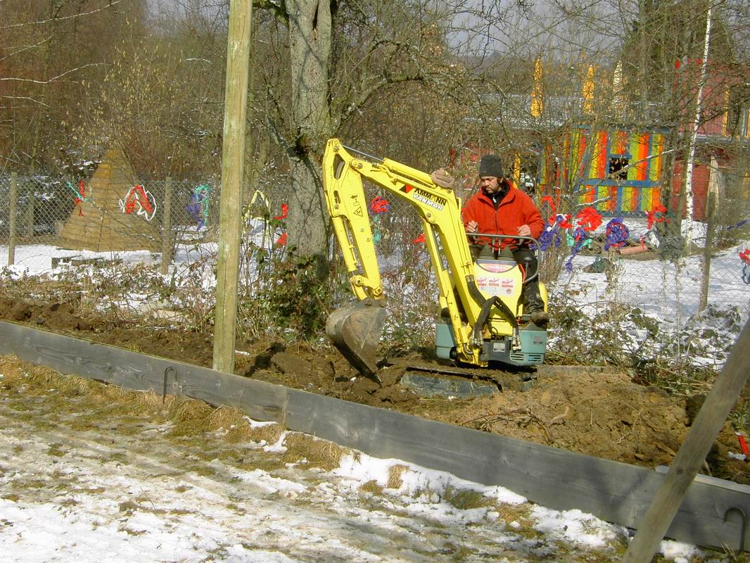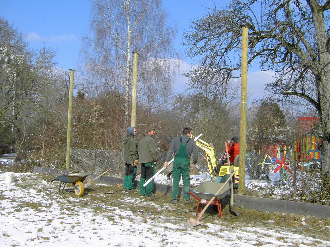 Am 13.03.2006 wurde dann der Ballfangzaun zum Außengelände der KITA Meluner 20 hin aufgestellt. Zum setzen der fünf 4 Meter hohen Masten brachte die ausführende Firma ...  ... einen kleinen Bagger mit. Wir hatten dann darum gebeten, damit auch gleich die Fundamente für die beiden Tore aus dem gefrorenen Boden auszuheben. Es war dann sogar noch Zeit genug, auch gleich die Tore auf dem alten Bolzplatz auszugraben.