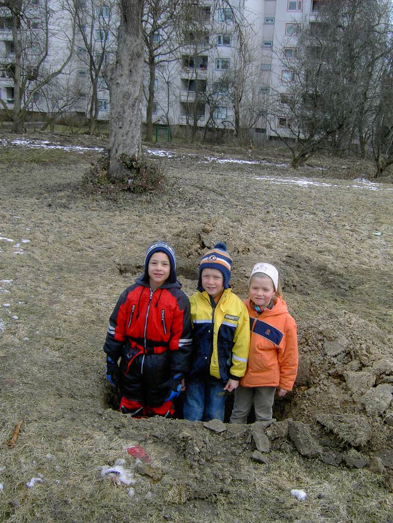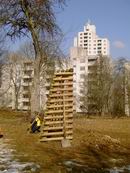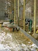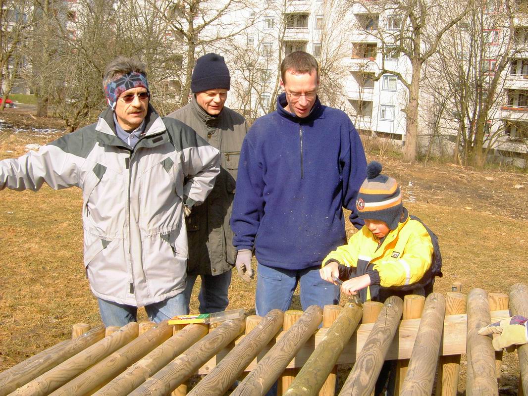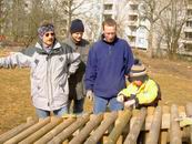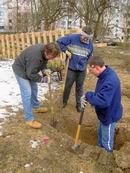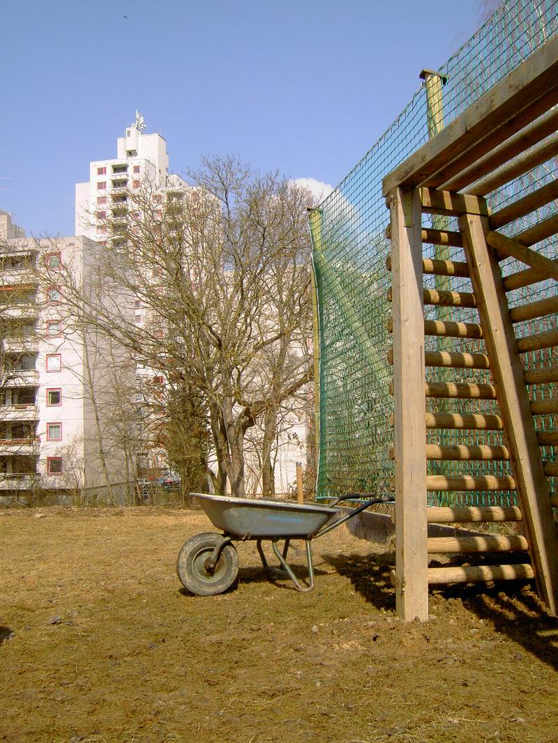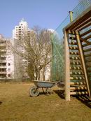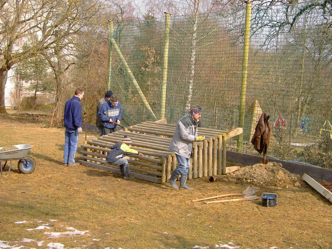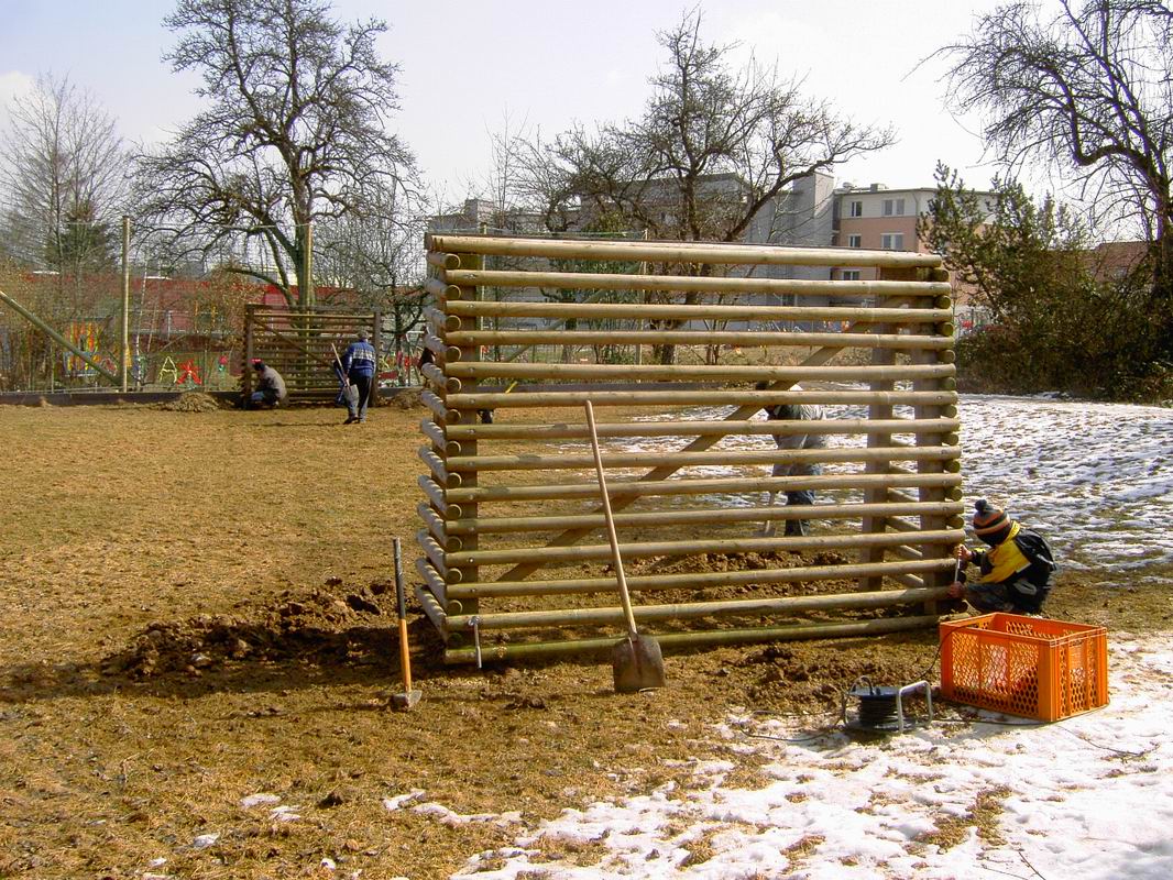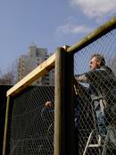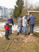 Am 13.03.2006 wurde dann der Ballfangzaun zum Außengelände der KITA Meluner 20 hin aufgestellt. Zum setzen der fünf 4 Meter hohen Masten brachte die ausführende Firma ...  ... einen kleinen Bagger mit. Wir hatten dann darum gebeten, damit auch gleich die Fundamente für die beiden Tore aus dem gefrorenen Boden auszuheben. Es war dann sogar noch Zeit genug, auch gleich die Tore auf dem alten Bolzplatz auszugraben.