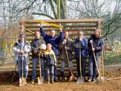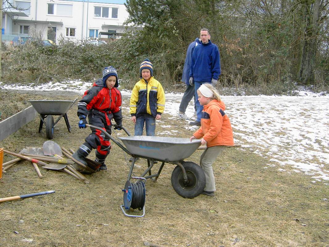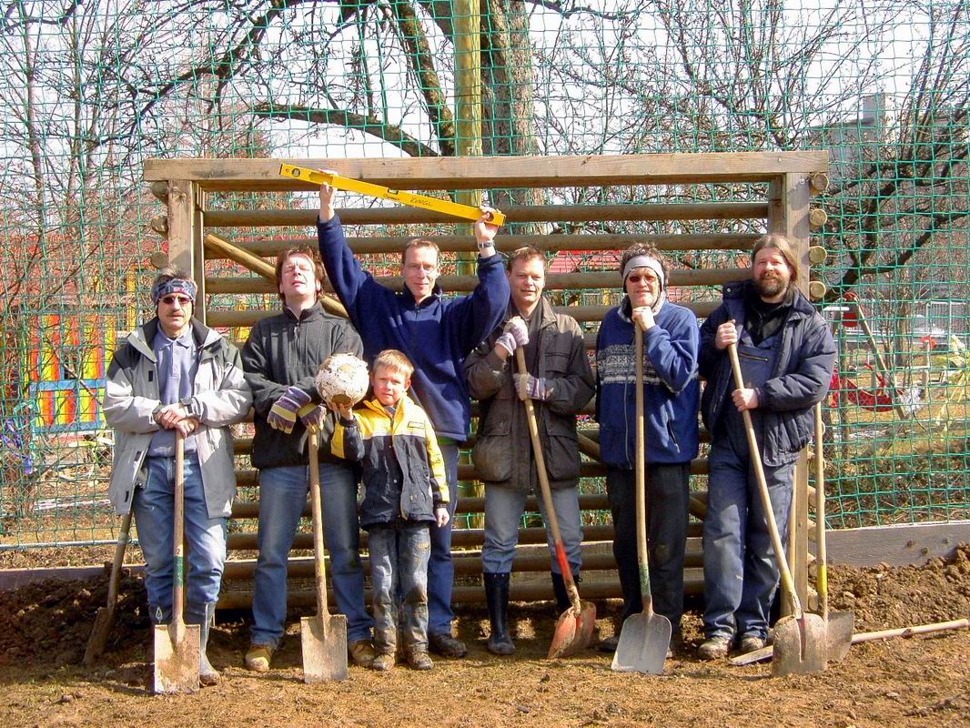 Am Samstag trafen wir uns dann am neuen Bolzplatz, um die Tore zu versetzen. Auch zukünftige Größen des Fußballs packten kräftig mit an. Ganz schön tief, die Fundamente für die beiden Tore.