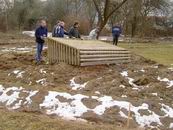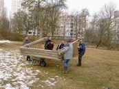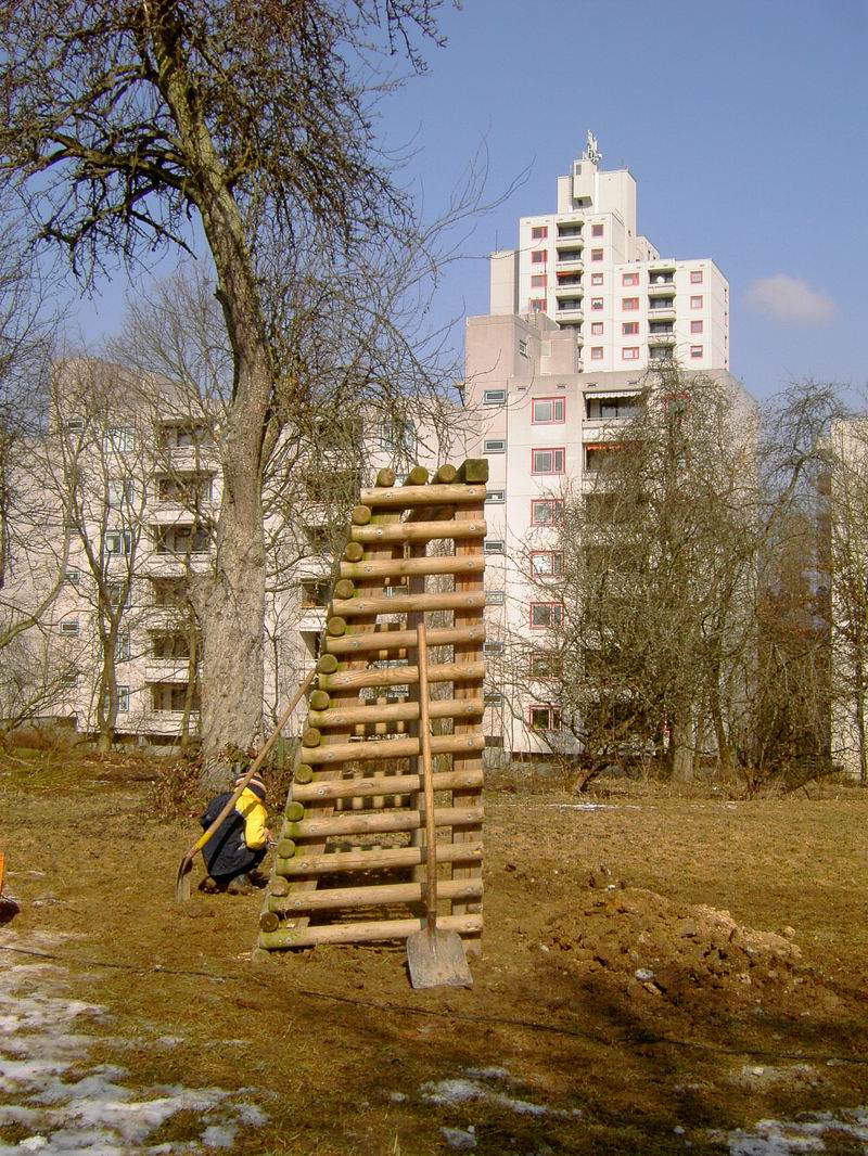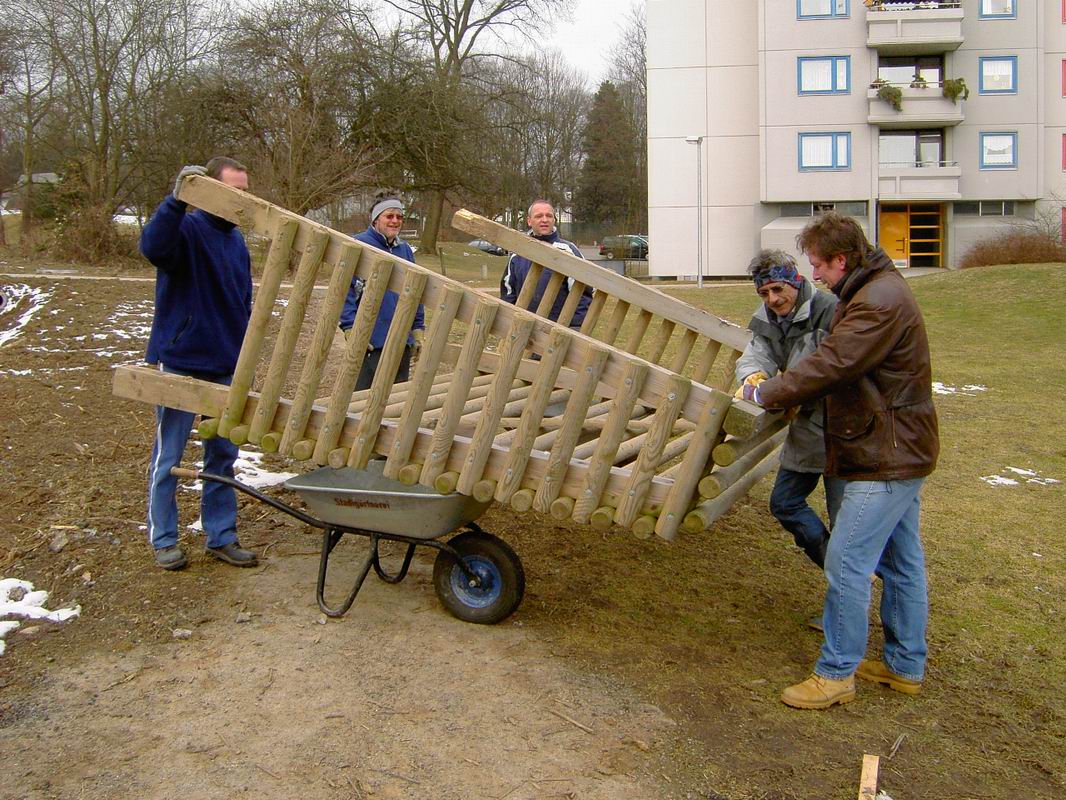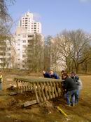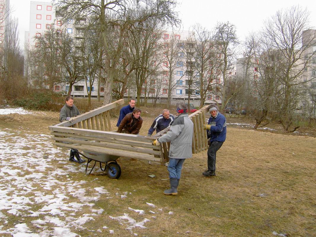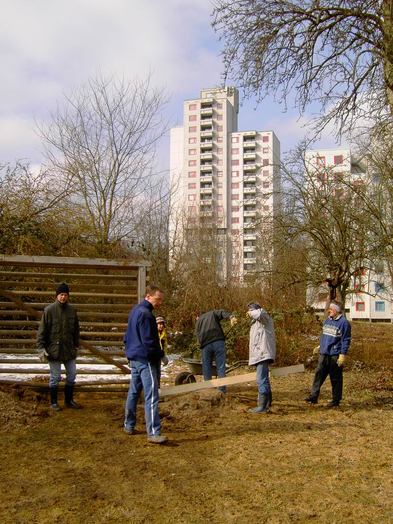 Im Oktober 2005 wurden dann die Mittel für die Grünanlage freigegeben [GRDrs 929-2004 Mittelfreigabe für den 1. Bauabschnitt am 04.10.2005 ]. Die Rodungsarbeiten begannen dann auch schon im Winter. Das Garten- und Friedhofsamt verlangte dann den Abbau der Tore bis spätestens 20. März 2006. Deshalb haben wir am Samstag 18. März 2006 die beiden Tore vom alten Bolzplatz auf den neuen versetzt.