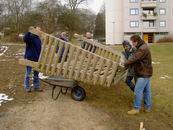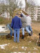 Da mussten wir eben auf der linken Seite noch etwas mehr ausheben. Doch erstmal holen wir das zweite Tor.  Mit Schubkarre und 7 Mann ran ans Tor. Aber wo ist Nr. 7? Ach ja, auf den Fotograf muss man halt immer warten ;-) So, und jetzt rein in die Fundamente. Und steht's grade? Nö, also wieder raus aus den Kartoffeln.