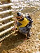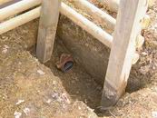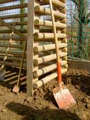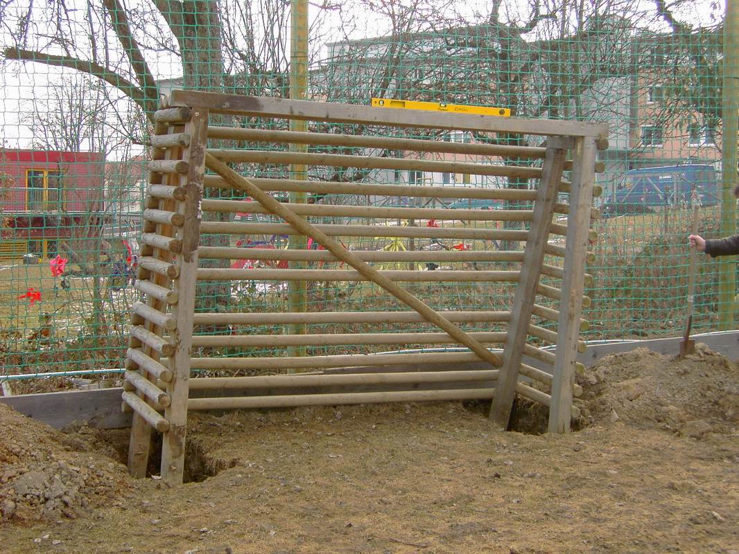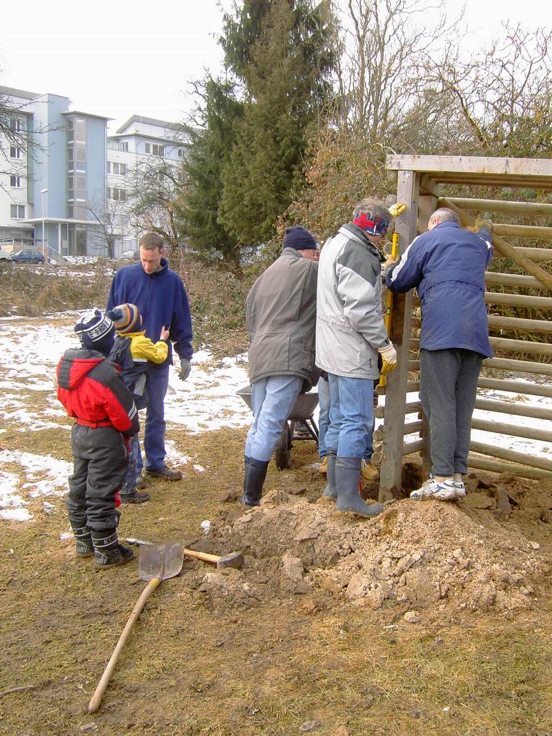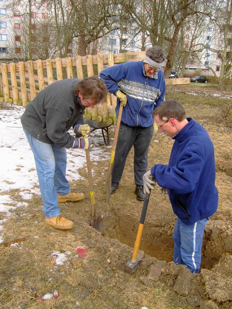 Und noch mal graben. So machten wir dann "tief- schürfende" Erfahrungen mit gefrorenem Boden. Jetzt aber, noch mal rein damit und ausrichten.  Grade, senkrecht und nicht schief. Ist doch ganz einfach, oder nicht?