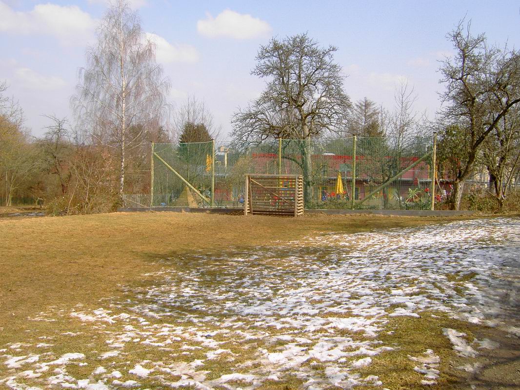 Zusammen mit dem Garten- und Friedhofsamt hatten wir uns dann überlegt, wo wir im Grünzug einen Bolzplatz anlegen könnten. Die Kindertagesstätte (KITA) Meluner 20 wurde damals ja schon auf dem Gelände errichtet, das auf dem Bebauungsplan von 1995 als Schulgelände deklariert ist. Hinter dem Außengelände der KITA und neben dam alten Querweg war ausreichend Platz für die Anlage eines neuen Bolzplatzes. Das Schulverwaltungsamt wollte damals zwar einen Schulneubau auf diesem Gelände noch nicht ganz ausschließen, stimmte aber der temporären Anlage eines Bolzplatzes an der von uns vorgeschlagenen Stelle zu. Der Platz wurde also Ende 2003 angelegt und eingesät. Die Erde und der Rasen konnten sich im Jahr 2004 setzen und festigen.