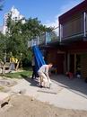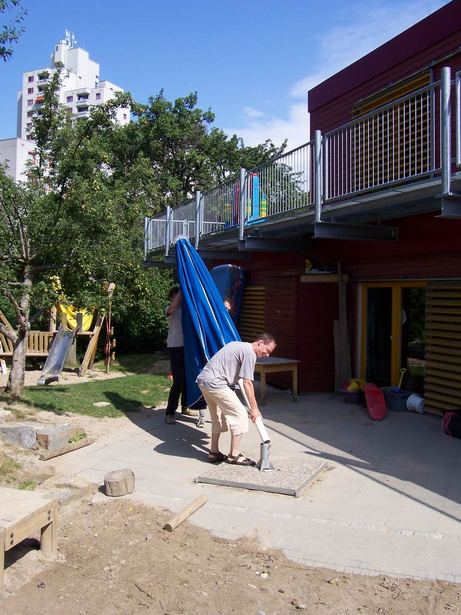 Schirme werden wieder in den Gärten der KITAs aufgestellt. |