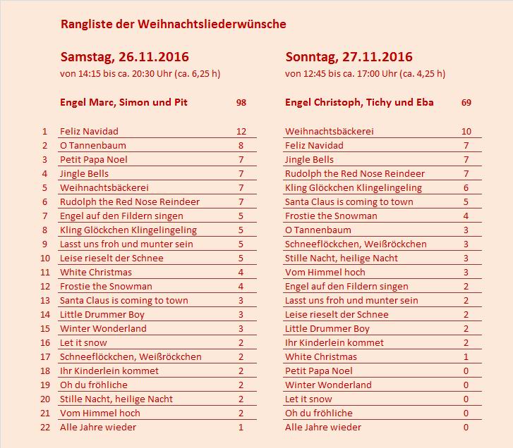 gewünschten Weihnachtslieder am Samstag und am Sonntag |