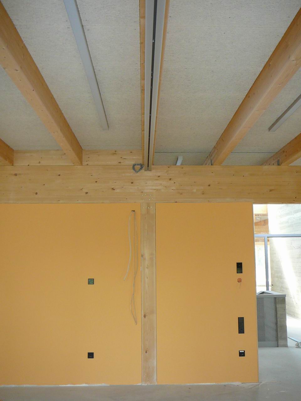 Das rechte Bild zeigt die am Deckenbalken montierte Laufschiene der Faltwand.